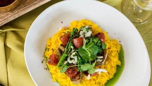 Doradefilet op risotto, geserveerd met doperwt en jus van venkel
