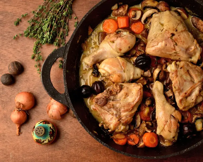 Unsere Köche bereiten Lammkarree, Côte de Bœuf, Boeuf Bourguignon, Coq au Vin, Lachs und Bouillabaisse frisch für Sie zu. Vegetarische Optionen: Ratatouille Niçoise und cremiger Gratin Dauphinois.