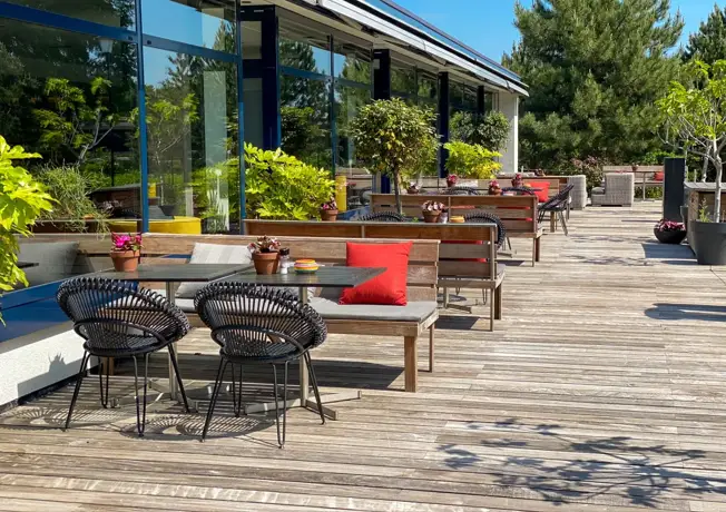 Unsere sonnige Terrasse ist der perfekte Ort, um zu entspannen, ein Getränk zu genießen oder gemütlich zu lunchen. Umgeben von einer einladenden Atmosphäre können Sie hier die frische Luft, ein gutes Gespräch oder einfach nur die Ruhe genießen. Ob Sie einen Kaffee, ein erfrischendes Getränk oder eine leckere Mahlzeit genießen möchten – unsere Terrasse bietet immer einen entspannten Ort, um den Moment zu genießen.
