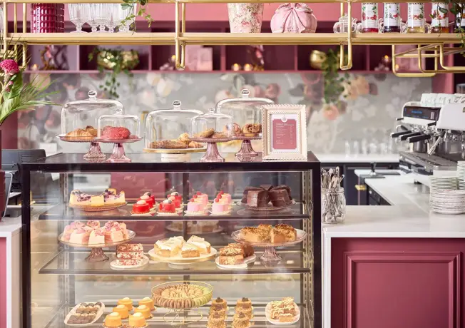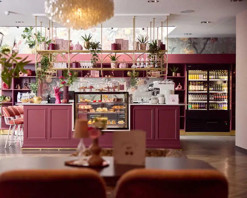 Located in the lobby, the Cherry Lounge is the beating heart of the hotel, where hospitality, craftsmanship and connection take center stage. With a charming pink and cherry-red interior, surrounded by flowers and a touch of French chic, the Cherry Lounge offers a unique experience for anyone seeking refinement. Enjoy breakfast, coffee, lunch or drinks, opt for take away, or play a game together at the large table. Or take something delicious home or on the go – our showcase features the finest cakes and pastries!