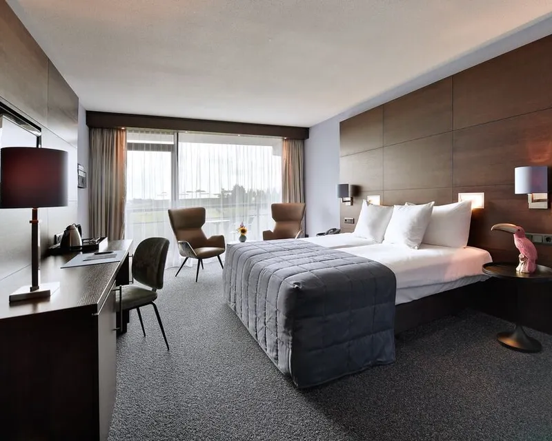 The spacious Comfort hotel rooms of Van der Valk Hotel Sassenheim-Leiden are stylishly furnished and offer ultimate comfort during your stay. The Comfort rooms, with an area of 35 m², are equipped with comfortable box-spring beds for a good night's sleep and are equipped with climate control.The royal armchair, Nespresso machine and flat-screen TV make your stay even more comfortable! The luxurious bathroom has a bath with seperate shower, hairdryer and various toiletries. All Comfort hotel rooms have a balcony.