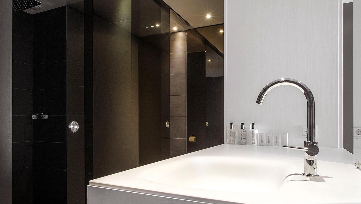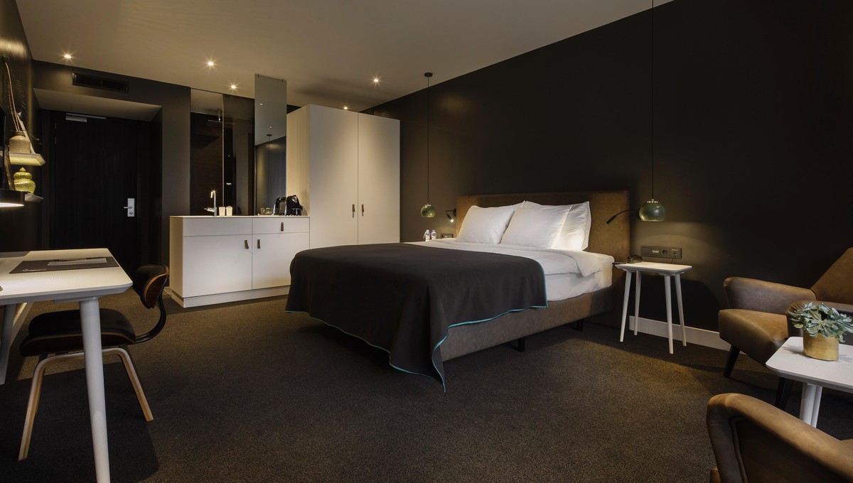 Our spacious Deluxe rooms are finished with high-quality materials and have a modern and warm interior. The rooms are arranged as a studio with more than enough storage space for clothes, valuables and / or a laptop. The open bathroom has a spacious shower cabin with rain shower. The lightning in the room can be adjusted according to personal preference. The rooms are also equipped with the latest climate control systems, with which you can set your desired room teperature yourself and you are assured of clean and fresh air. All Deluxe hotel rooms have a balcony.