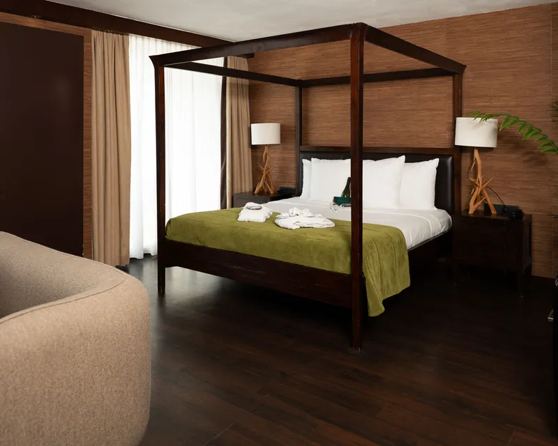 La Suite South vous fait voyager vers les pays chauds. Après avoir pénétré dans cette chambre d’hôtel exclusive, vous vous retrouverez dans un tout autre monde. Cette suite est entièrement décorée dans le style africain. Un mélange de couleurs et de matières vibrantes vous fera oublier votre journée trépidante très vite et très facilement. Il va sans dire que la Suite South vous offre, tout comme les autres chambres de l’Hotel Sassenheim, luxe et confort avec, entre autres, un lit king size, une cheminée (électrique) et un minibar.