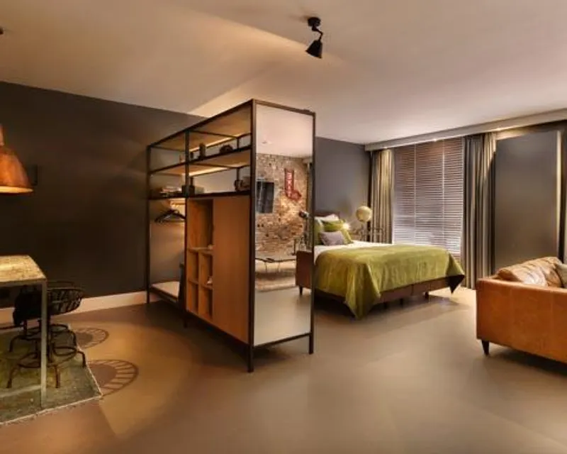 Dans notre Suite Ouest, vous vous retrouverez complètement dans Manhattan. Cette suite au style loft New Yorkais dispose d'un coin table séparé et d'un salon confortable et est habillée en style authentique. Prenez un délicieux bain (avec fonction bulle) ou une douche à effet pluie.