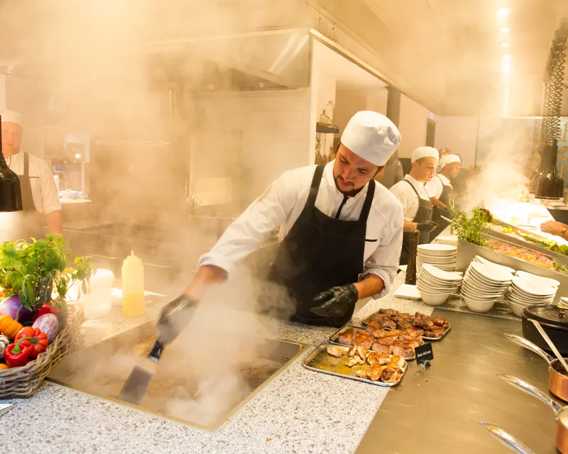 Le buffet Live Cooking comprend du vin maison, de la bière pression, de l'eau, des boissons non alcoolisées et du café/thé (max. 6 boissons alcoolisées par personne). Veuillez noter que des conditions et des tarifs différents s'appliquent les jours fériés. Les spécialités sont également exclues de ce forfait, comme le festival du poisson, le buffet de gibier et le buffet indien.